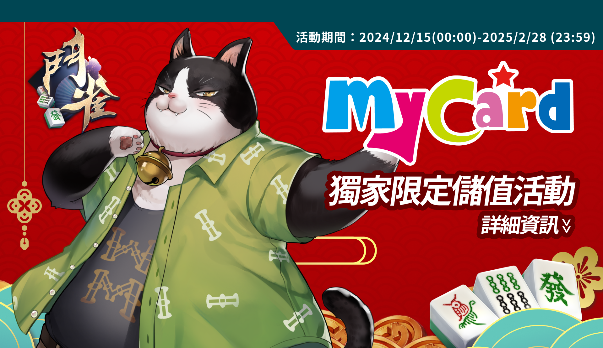 活動辦法:活動期間內使用任意地點購買之【Mycard點數卡】、【會員轉點】、【線上支付】等方式,購買任意面額MyCard點數並成功儲值至《鬥雀麻將》,即可獲得5%點數回饋!