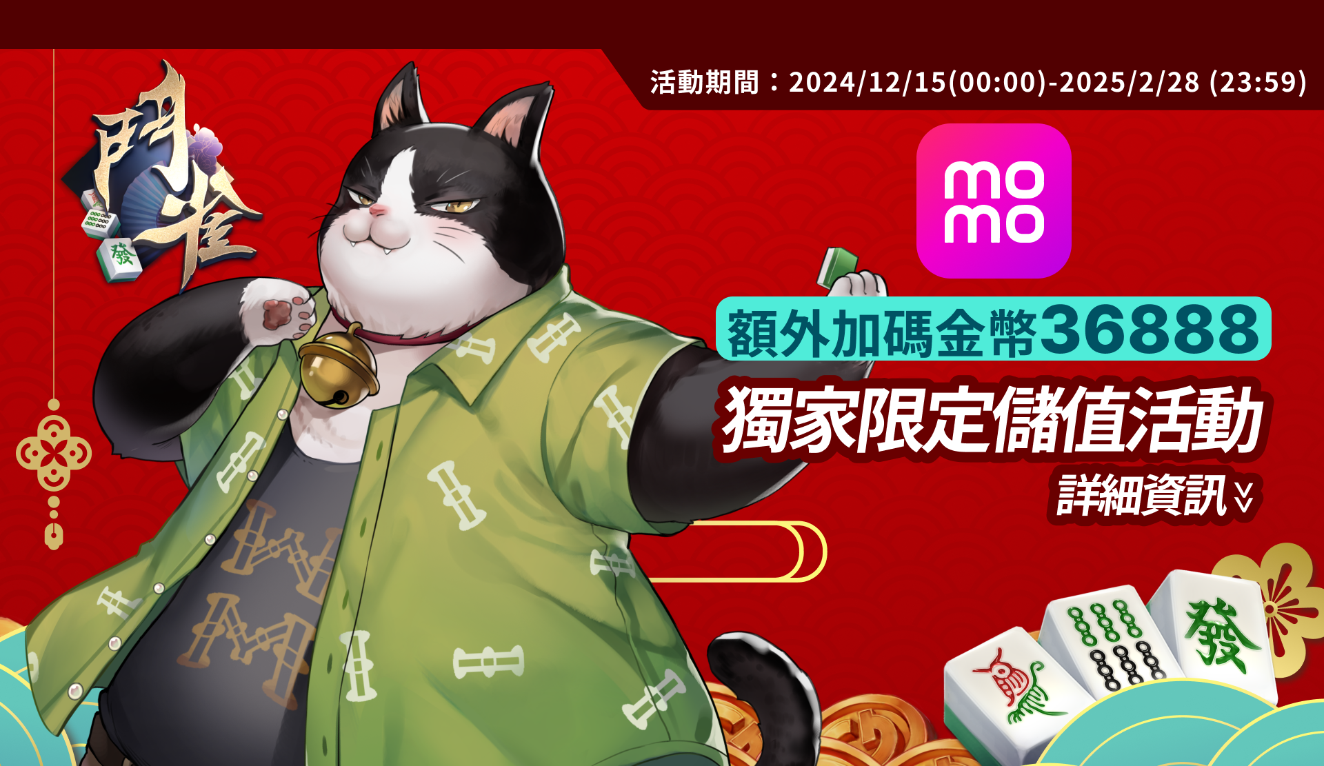 活動辦法:活動期間內至【MOMO】購買指定面額MyCard點數並成功儲值至《鬥雀麻將》,即可獲得5%點數回饋和最多金幣36888!